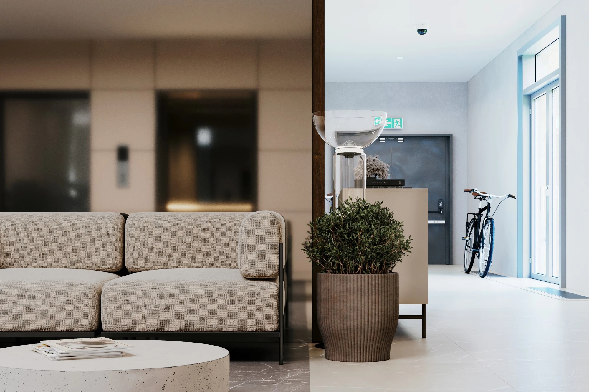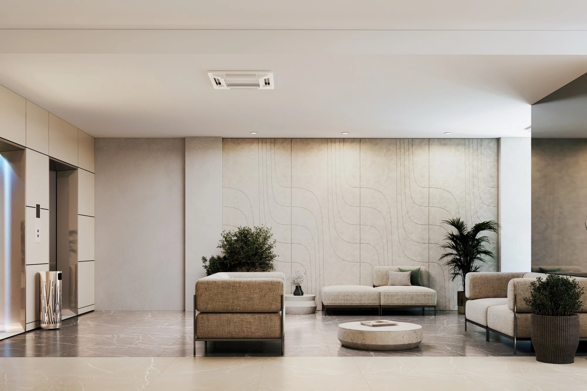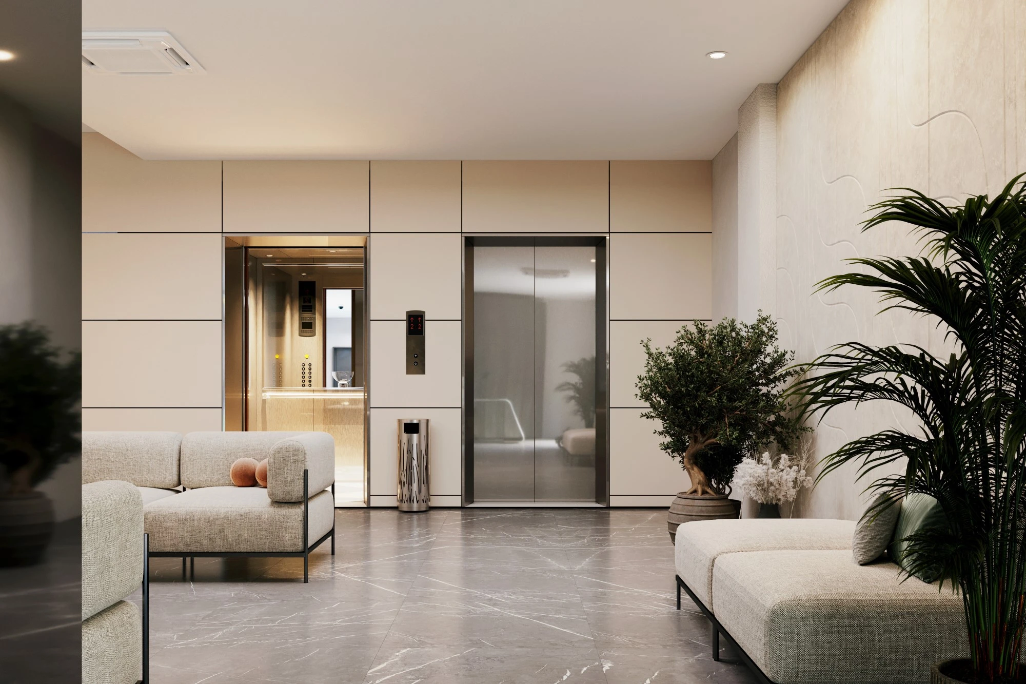 Специалисты архитектурного бюро MERTECO разработали концепцию входной группы современного комплекса апартаментов бизнес-класса на юго-западе Москвы. Дизайн выполнен в светлых тонах с использование натуральных материалов с преобладанием минималистичного стиля. Отделка стен реализована с помощью волнообразных рельефных панелей, которые добавляют динамики пространству и отлично сочетаются с контрастной отделкой напольного покрытия с фактурой мрамора. Полированные металлические панели в сочетании с деревянной отделкой из темного дерева создают яркий акцент и оживляют интерьер зоны ожидания.