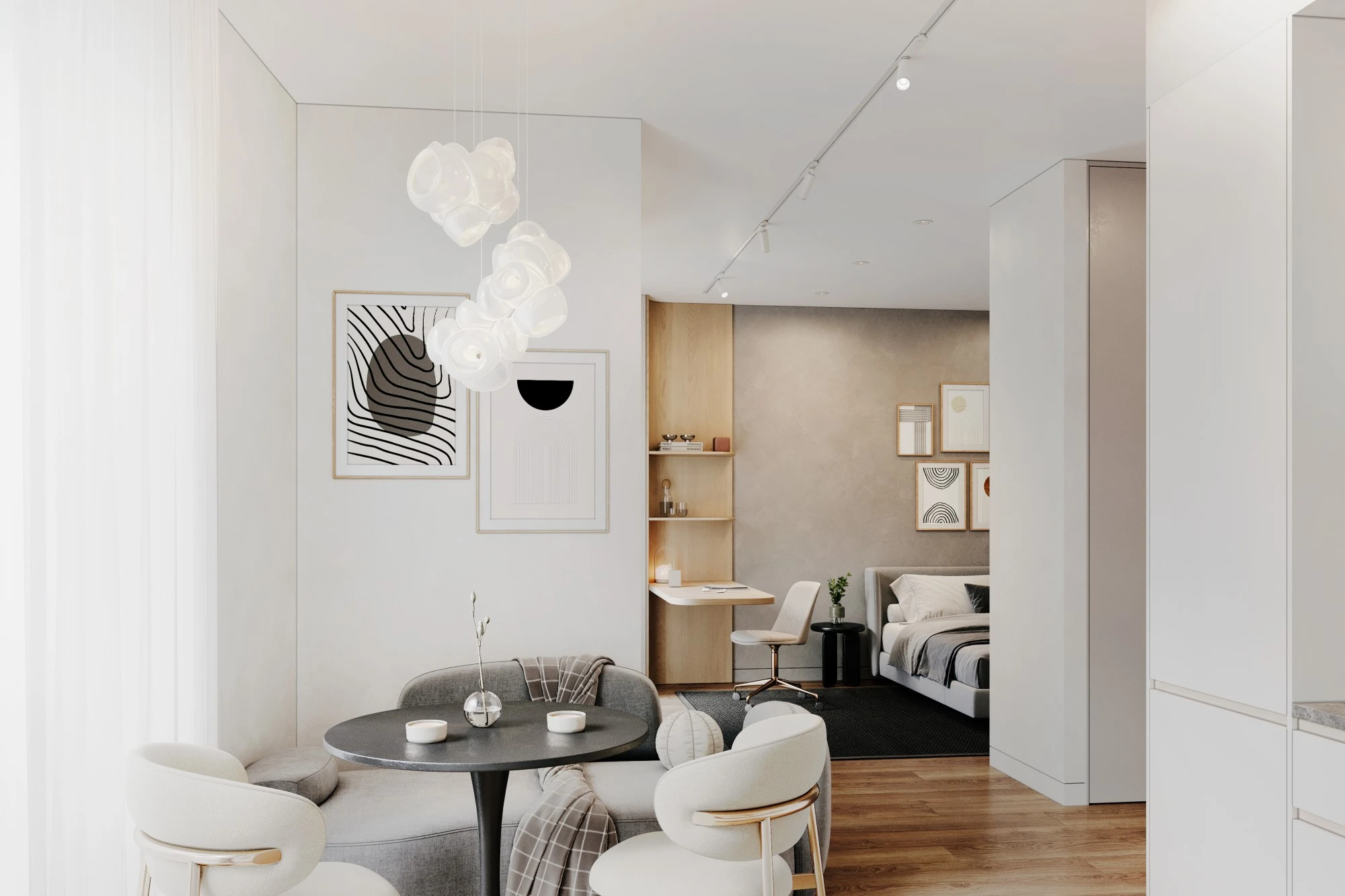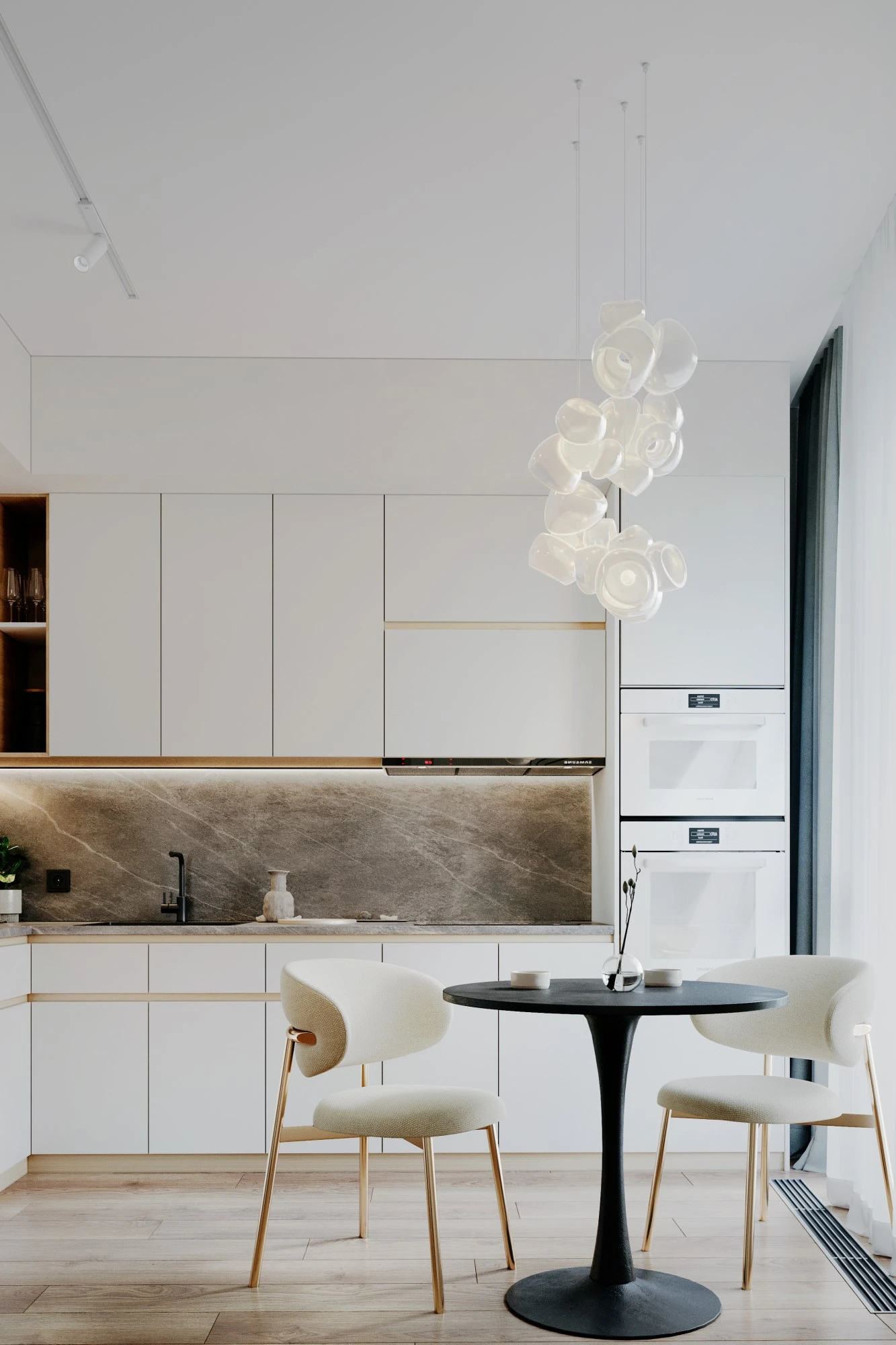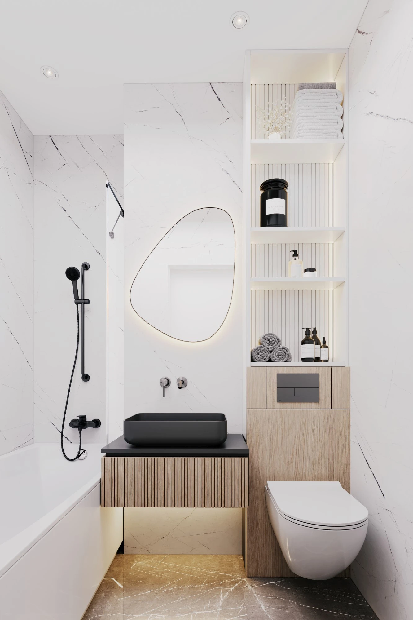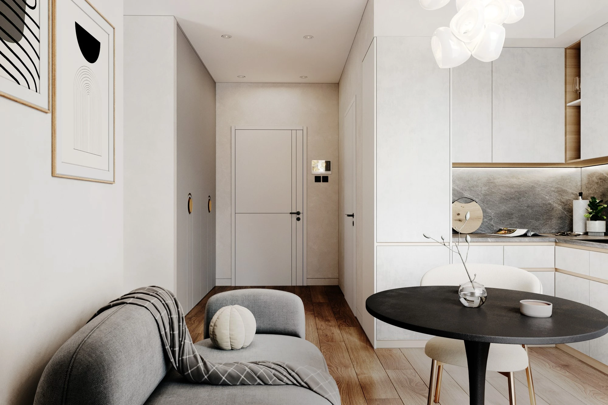 Специалисты архитектурного бюро MERTECO разработали концепцию входной группы современного комплекса апартаментов бизнес-класса на юго-западе Москвы. Дизайн выполнен в светлых тонах с использование натуральных материалов с преобладанием минималистичного стиля. Отделка стен реализована с помощью волнообразных рельефных панелей, которые добавляют динамики пространству и отлично сочетаются с контрастной отделкой напольного покрытия с фактурой мрамора. Полированные металлические панели в сочетании с деревянной отделкой из темного дерева создают яркий акцент и оживляют интерьер зоны ожидания.