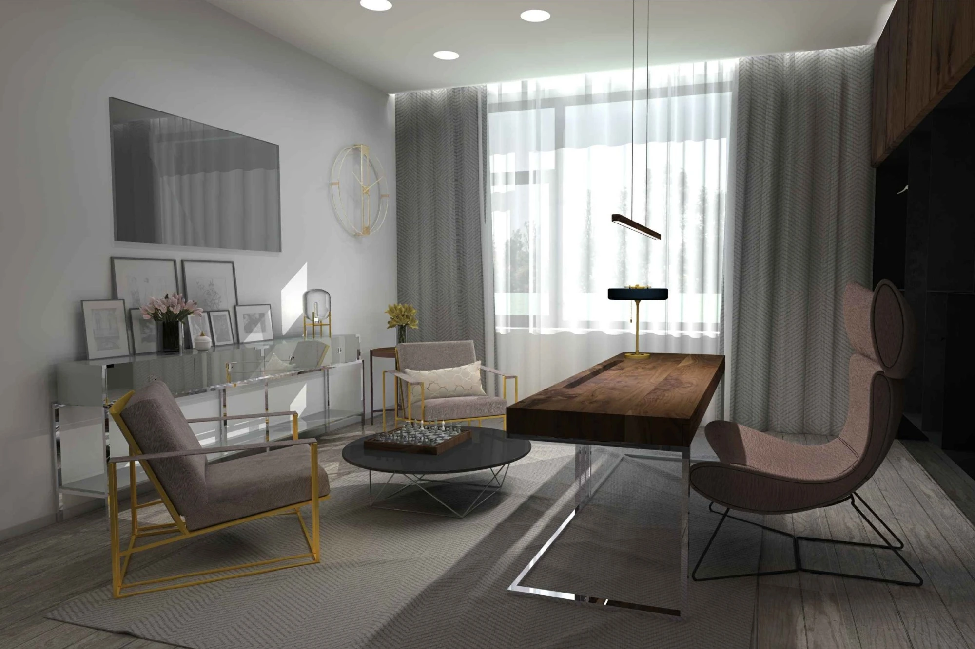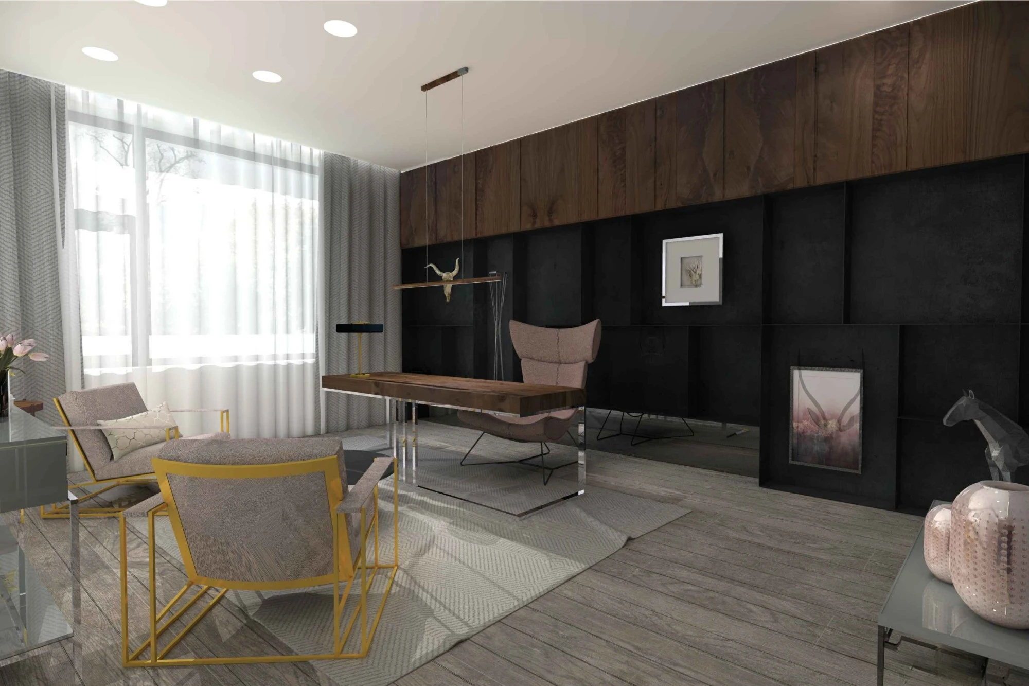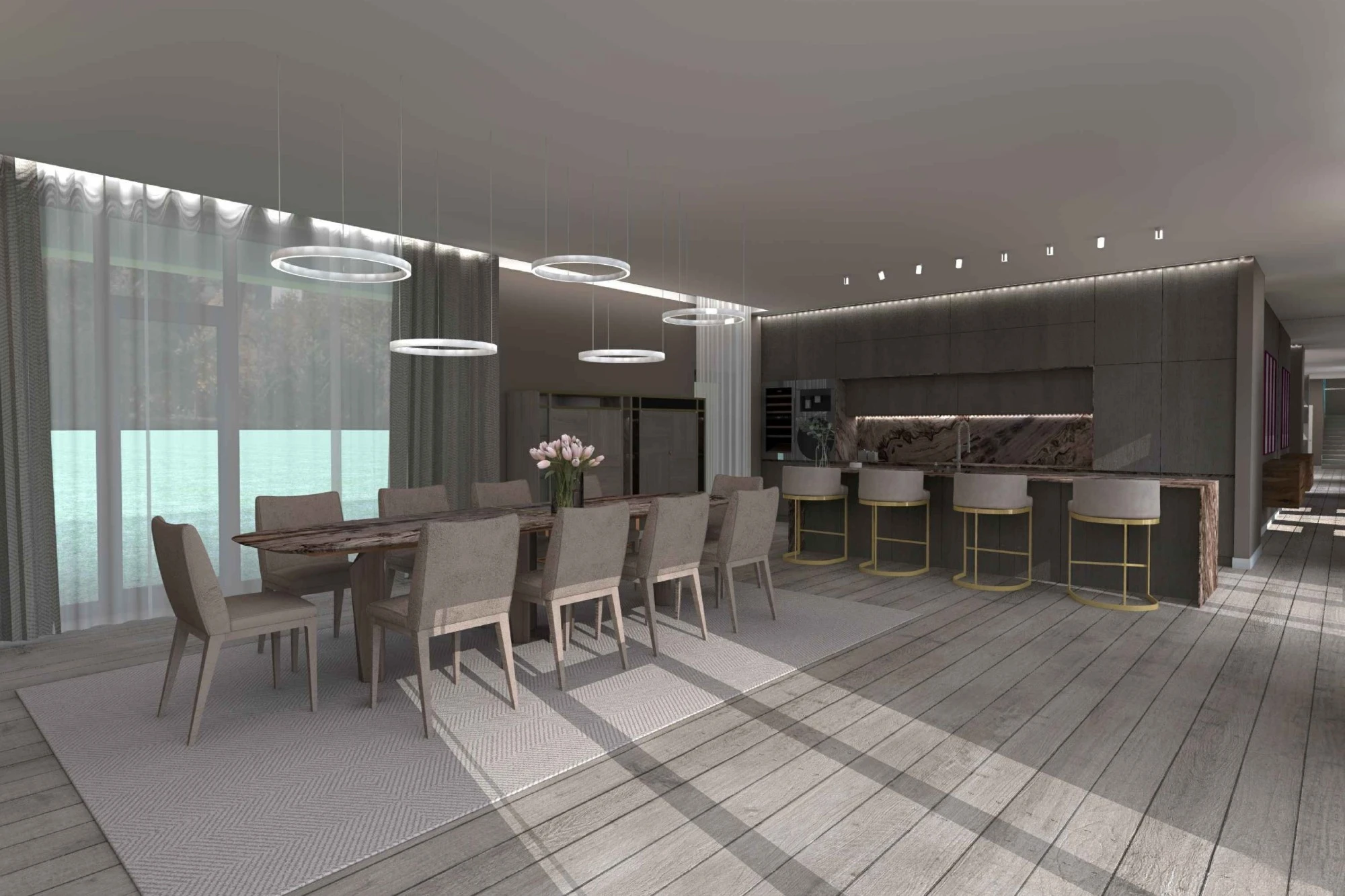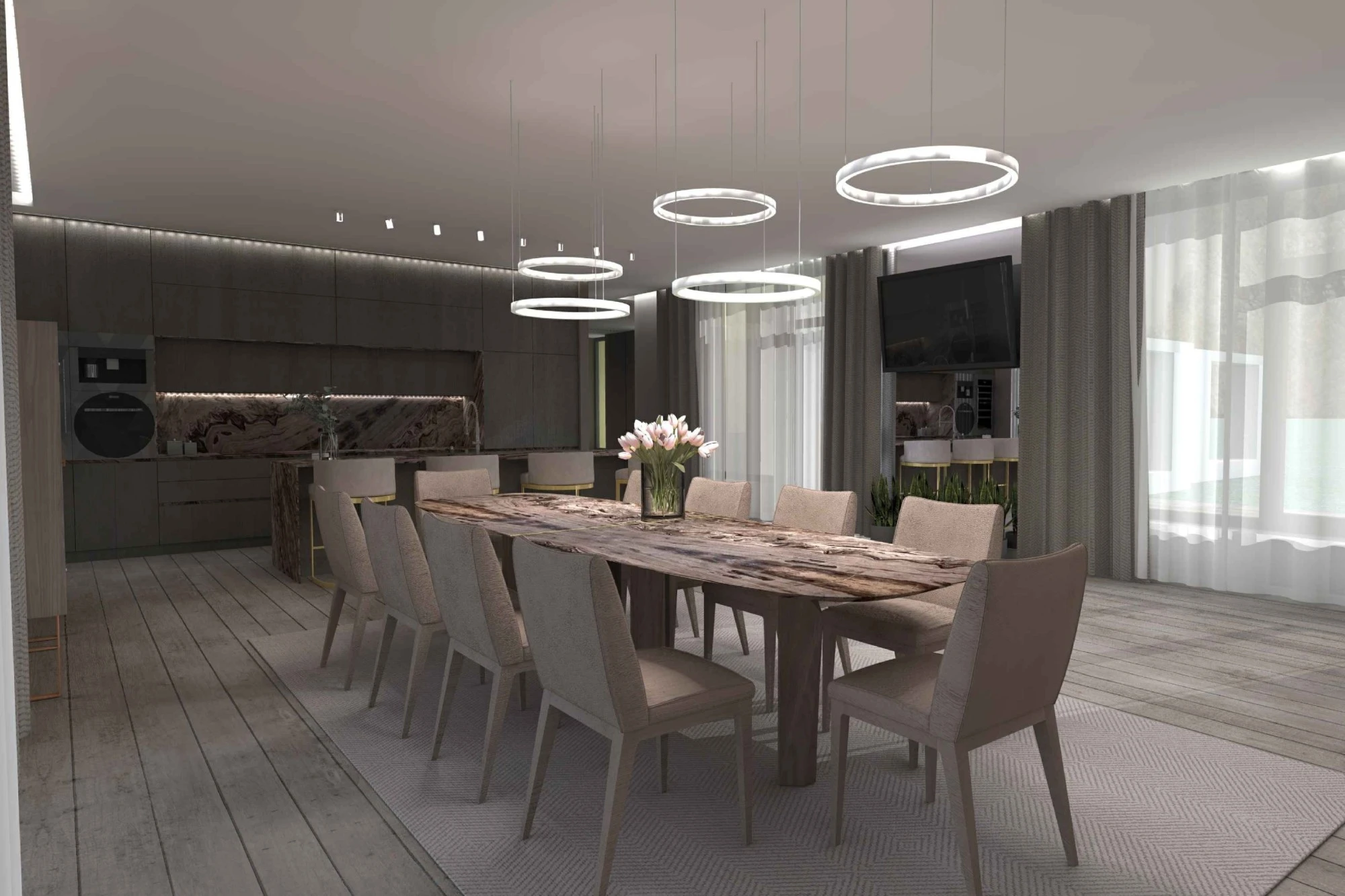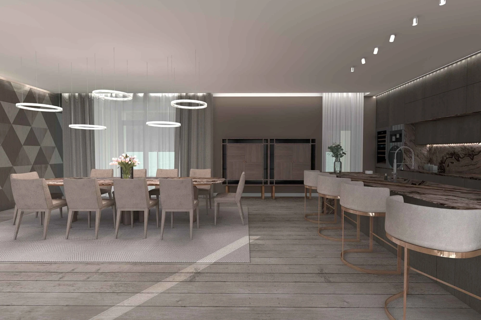 Двухэтажный частный дом расположен в коттеджном поселке «Миллениум парк» и предназначается для семьи, сочетая в себе комфорт, функциональность и уют. В доме предусмотрены: мастер-спальня, две детские спальни, две гостевые спальни, рабочий кабинет, кухня-столовая и большая гостиная. Также в доме располагается бильярдная, спортзал, зона СПА с сауной и баней. Форма строения обеспечивает приватную зону в центральной части, где расположена большая терраса, имеющая отдельные проходы из кухни-столовой и зоны СПА. Такое расположение террасы позволяет использовать её с максимальной функциональностью при различных сценариях в любое время года. На территории имеется отдельностоящий гараж с удобным выходом к жилому дому и подсобными помещениями, в которых возможно организовать комнату отдыха для обсуживающего персонала.