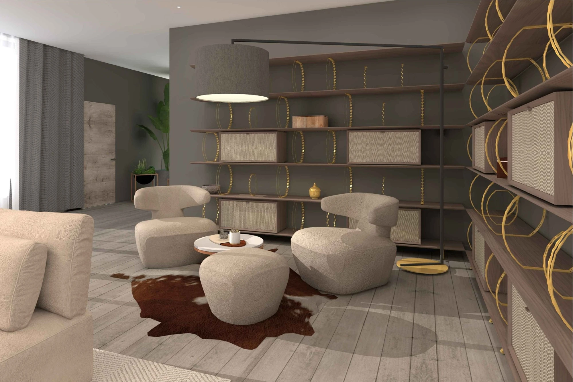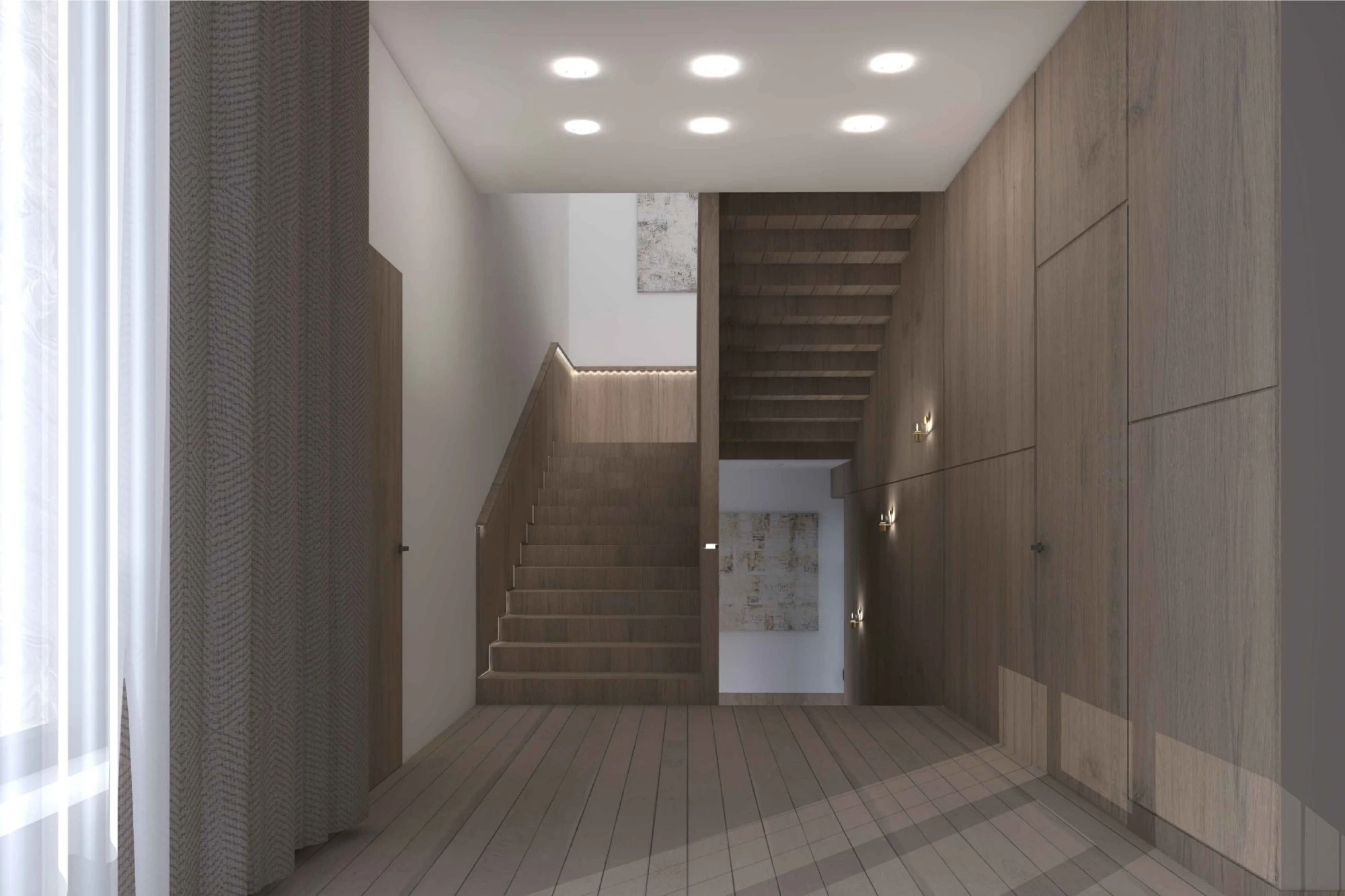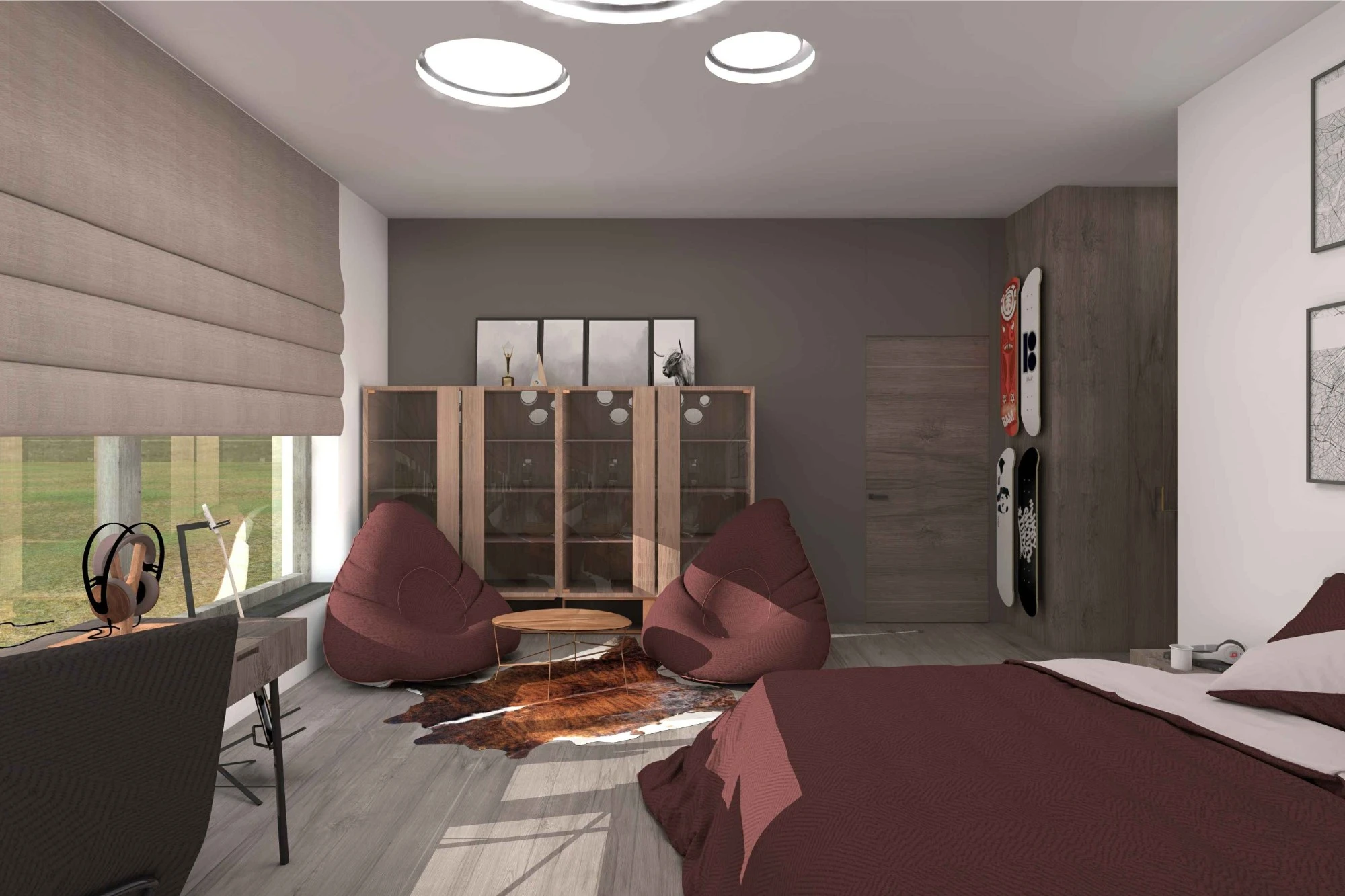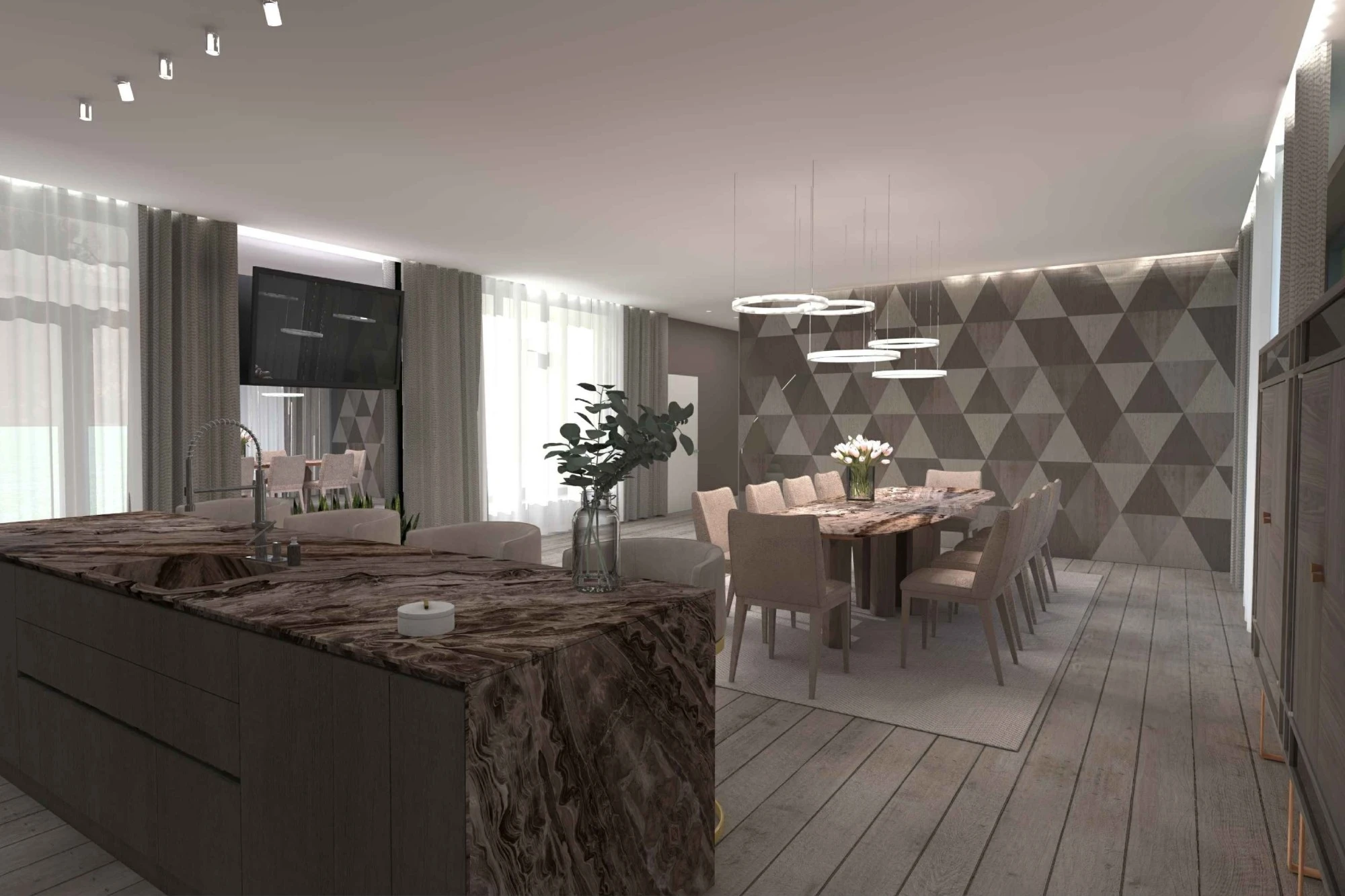 Двухэтажный частный дом расположен в коттеджном поселке «Миллениум парк» и предназначается для семьи, сочетая в себе комфорт, функциональность и уют. В доме предусмотрены: мастер-спальня, две детские спальни, две гостевые спальни, рабочий кабинет, кухня-столовая и большая гостиная. Также в доме располагается бильярдная, спортзал, зона СПА с сауной и баней. Форма строения обеспечивает приватную зону в центральной части, где расположена большая терраса, имеющая отдельные проходы из кухни-столовой и зоны СПА. Такое расположение террасы позволяет использовать её с максимальной функциональностью при различных сценариях в любое время года. На территории имеется отдельностоящий гараж с удобным выходом к жилому дому и подсобными помещениями, в которых возможно организовать комнату отдыха для обсуживающего персонала.